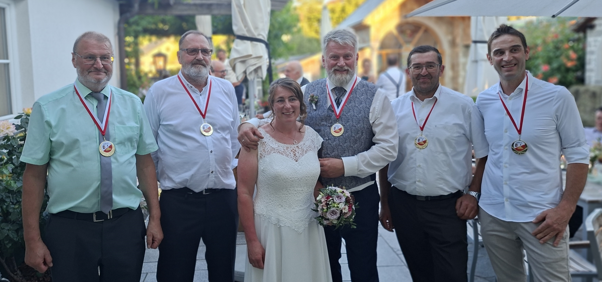 Im Anschluss an die Siegerehrung reisten die Schützen zum frisch vermählten Sektionsleiter Wolfgang Friesenecker, der auch die gesamten Vorrunden-Spiele im Einsatz war, und überreichten ihm die wohl verdiente Landes-Liga-Sieger-Medaille.