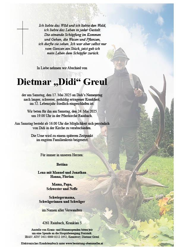 Dietmar Greul ist am Samstag den 17. Mai 2025 nach langer, schwerer, geduldig ertragener Krankheit im 52. Lebensjahr friedlich eingeschlafen.